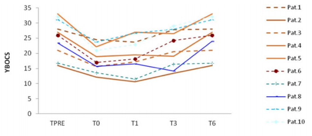 在这项研究中使用的主要测量系统是耶鲁-布朗强迫症量表(Y-BOCS),这是衡量强迫症症状严重程度的金标准。结果发现,所有患者的强迫症症状直至T1,其中4例至T3改善。与其他参与者相比,这些患者表现出更广泛的额区相位同步和额顶相干的重塑。