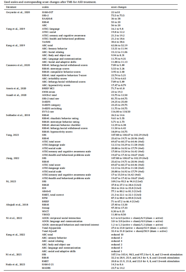 In summary, since 2018, studies on the use of TMS to treat ASD have demonstrated significant variability in bias risk, stimulation sites, and stimulation parameters. Recent findings generally indicate positive effects of TMS on stereotyped behaviors, repetitive behaviors, language, and social interactions, leading to overall improvements in all assessment scale scores following intervention.
