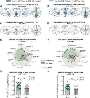 The study examined the overall changes in amygdala functional connectivity following cTBS treatment. In the AOFC group, cTBS significantly reduced the functional connectivity of the right amygdala with multiple brain regions (Figures 4A, E). In the NO group, cTBS only significantly reduced the functional connectivity of the right amygdala with the precuneus and thalamus (Figure 4C). The average reduction in right amygdala functional connectivity was significantly greater in the AOFC group compared to the NO group (t = 3.035, p = 0.005, pFDR = 0.005, Cohen’s d = 1.075) (Figure 4G). After cTBS treatment, similar reductions in functional connectivity were observed in the left amygdala (Figures 4B, D, F). The average reduction in left amygdala functional connectivity associated with cTBS treatment was significantly higher in the AOFC group compared to the NO group (t = 3.707, p < 0.001, pFDR = 0.001, Cohen’s d = 1.31, Figure 5H). These results suggest that in the AOFC group, cTBS induced a reduction in right amygdala functional connectivity, with a more pronounced change compared to the NO group, indicating extensive modulation of amygdala network connectivity following personalized treatment.