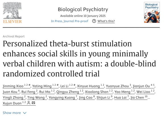 In January 2025, Professor Duan Xujun's team from the University of Electronic Science and Technology published a groundbreaking study in the internationally renowned journal Biological Psychiatry, titled "Personalized theta-burst stimulation enhances social skills in young minimally verbal children with autism: a double-blind randomized controlled trial". The study utilized personalized brain imaging analysis technology and implemented a continuous theta burst stimulation (cTBS) protocol to precisely target the amygdala and its neural circuits in children with autism. This intervention achieved significant therapeutic effects.