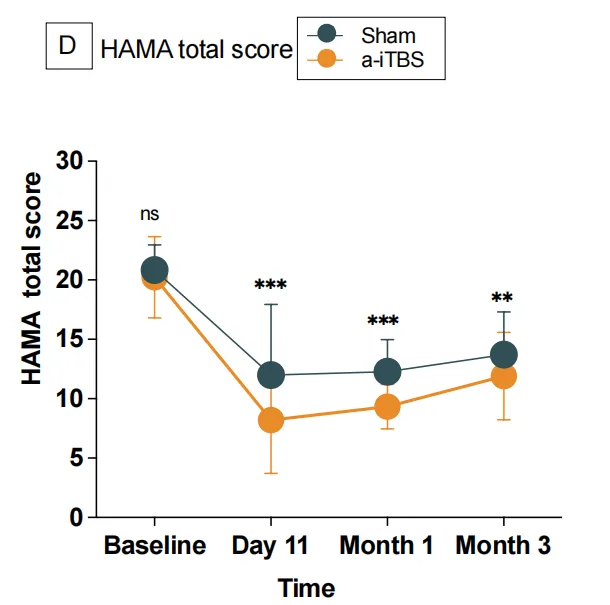 The a-iTBS group showed a significantly greater reduction in mean HAMA scores compared to the sham group (active: 8.52, sham: 13.61; mean difference: 5.09 points, *p* < 0.001).