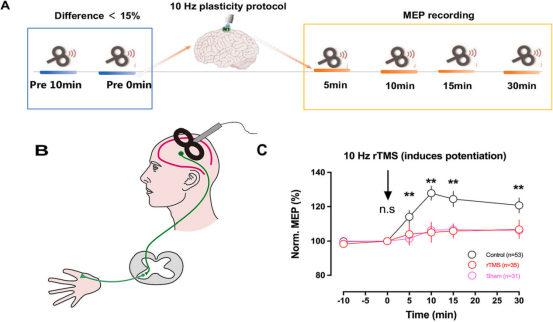 Fig: Diminished cortical plasticity in MDD patients. A: Flowchart of the whole experiment. B: Design of TMS and MEP recordings. A single TMS pulse was delivered to the left motor cortex, and the MEP was recorded from the abductor pollicis brevis of the right hand. C: In the healthy control, 10 Hz repetitive TMS (rTMS) stimulation rapidly enhanced MEPs and the potentiated MEPs for at least 30 min, while in the depression group, evident potentiation was missing.