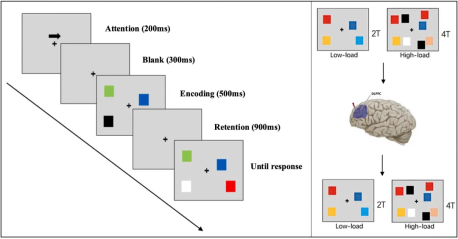 Accuracy, response time (RT), and memory capacity (calculated using Cowan's K formula) were recorded. EEG signals were analyzed in three stages: attention (500 ms), encoding (500 ms), and retention (900 ms).