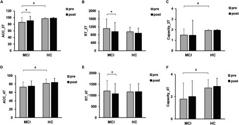 Figure 2: Changes in Working Memory Performance Between MCI and HC Groups. Under low memory load (2T), pre- and post-rTMS intervention comparisons for both groups: (A) overall mean accuracy, (B) response time, and (C) memory capacity. Under high memory load (4T), pre- and post-rTMS intervention comparisons for both groups: (D) overall mean accuracy, (E) response time, and (F) memory capacity. *p < 0.05, pre-intervention vs. post-intervention; #p < 0.05, MCI group vs. HC group. ACC: accuracy; RT: response time.